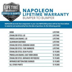 This gas BBQ grill head blends superior build quality with meticulous attention to detail. promising a delightful and efficient cooking experience. Designed to deliver exceptional performance over many years. it is supported by Napoleon’s President’s Limited Lifetime Warranty. ensuring lasting satisfaction and peace of mind for grill enthusiasts.