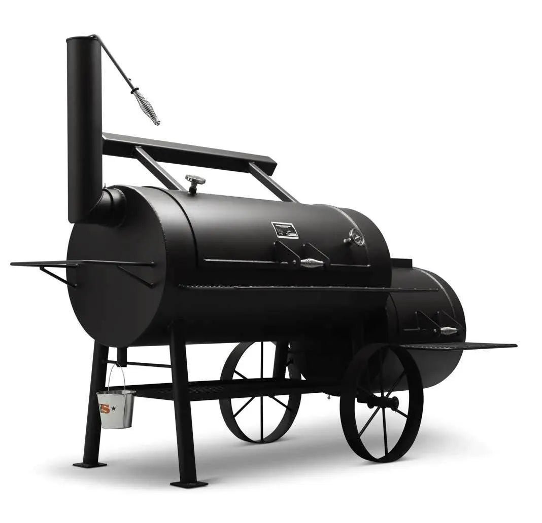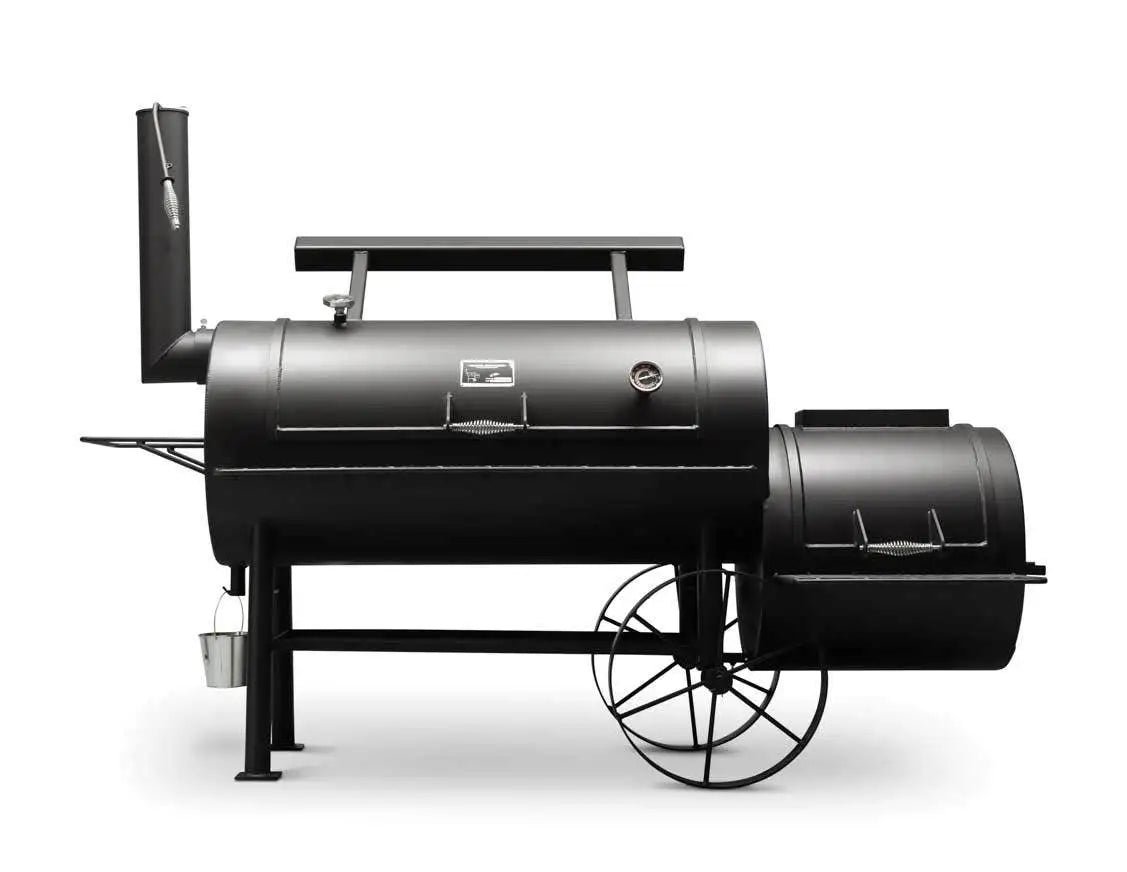 Crafted from heavy-duty 1/4 steel. the Kingman Offset Smoker ensures excellent heat retention and durability. Its large cooking chamber provides ample space for smoking briskets. ribs. pork shoulders. and more. while the adjustable firebox allows for precise temperature control. This American made offset smokers heavy-duty design is for people serious about quality wood smoke flavor. Enjoy years of use and confidence with it’s durable construction and superior heat management.